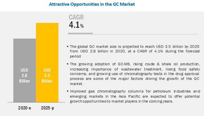 The global GC market size is projected to reach USD 3.5 billion by 2025 from USD 2.8 billion in 2020, at a CAGR of 4.1% during the forecast period. The growth in this market is driven by high the growing adoption of GC-MS, rising crude & shale oil production, increasing importance of wastewater treatment, rising food safety concerns, and growing use of chromatography tests in the drug approval process. However, the high cost of GC equipment, geopolitical issues prevailing in some countries, and shortage of skilled professionals are expected to restrain the growth of this market during the forecast period.